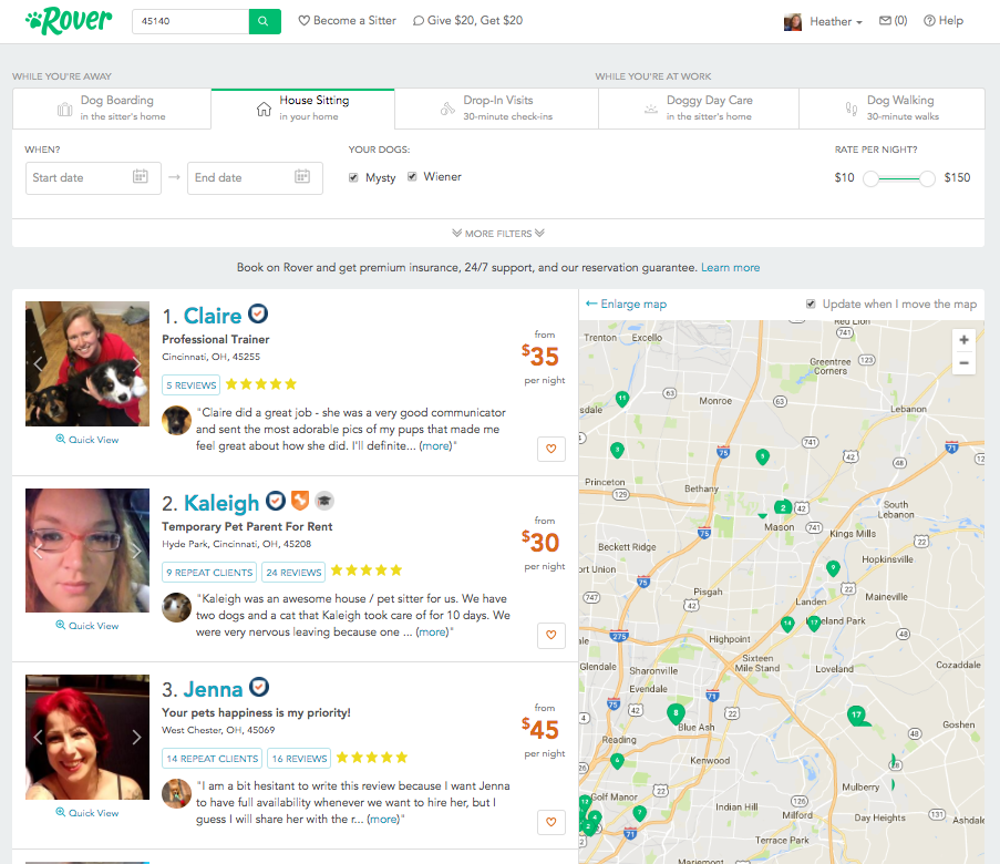 After that you get a list of potential sitters along with their bios, costs, reviews and locations. I like that there is a lot of information about each person. It gave me ample info to feel comfortable reaching out to potential sitters.
